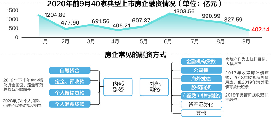 9月,40家典型上市房企共完成融资402.14亿元,环比下滑51.4% 刘国梅制图