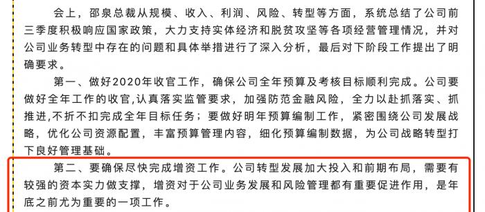 光大信托党委副书记、总裁邵泉在会上部署下阶段工作时明确要求,要确保尽快完成增资工作。邵泉表示,光大信托转型发展加大投入和前期布局,需要有较强的资本实力做支撑,增资对于公司业务发展和风险管理都有重要促进作用,是年底之前尤为重要的一项工作。