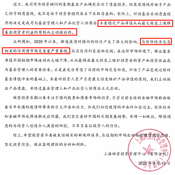 通常来说,私募基金清盘可能是出于以下原因——产品存续期满、业务结构调整、触及清盘线、业绩不佳主动清盘。市面上曾有人质疑映雪债券专项信托计划清盘是由于产品亏损到清盘线,但映雪资本方面回应称,是“本着稳定产品净值从而最大程度上保障基金投资者利益的原则而主动提出的”。