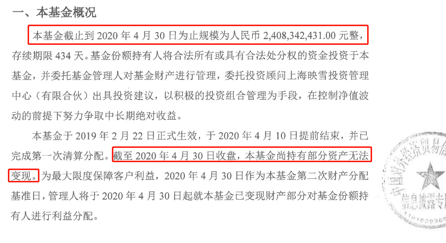 产品二次清算分配报告显示,截至2020年4月底(产品进入清算期当月),产品存续规模仍高达24亿元。