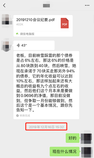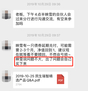 另外来自福建的郑姓投资者表示,自己得知基金踩雷西王债要赎回时收到了类似的答复,“映雪投资会尽快把净值做上去,建议不要赎回本金;还称‘映雪说出了问题会自己买下来(相关底层债券)’。”