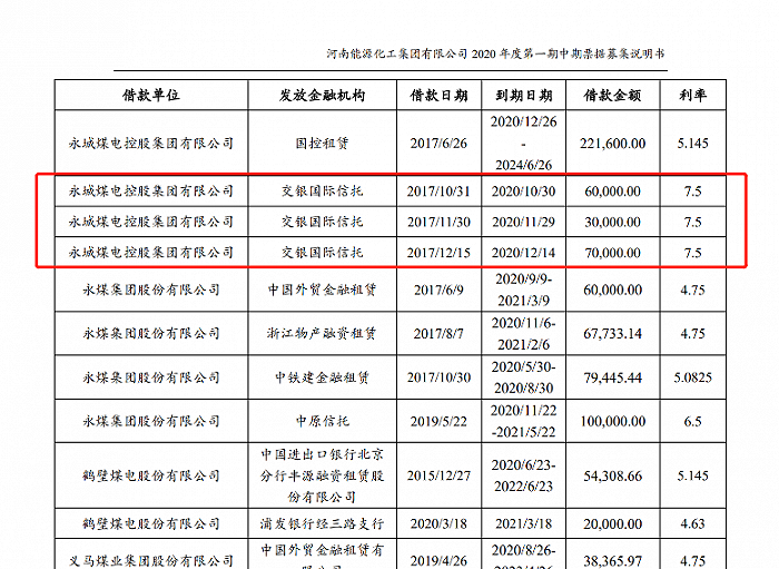 公布的债券募集说明书显示,永煤集团2017年四季度存在3笔来自于交银国际信托的借款,借款期限均为3年,利率7.5%,累计金额16亿元。其中一笔已经在10月30日到期,另外两笔也将在近期到期。