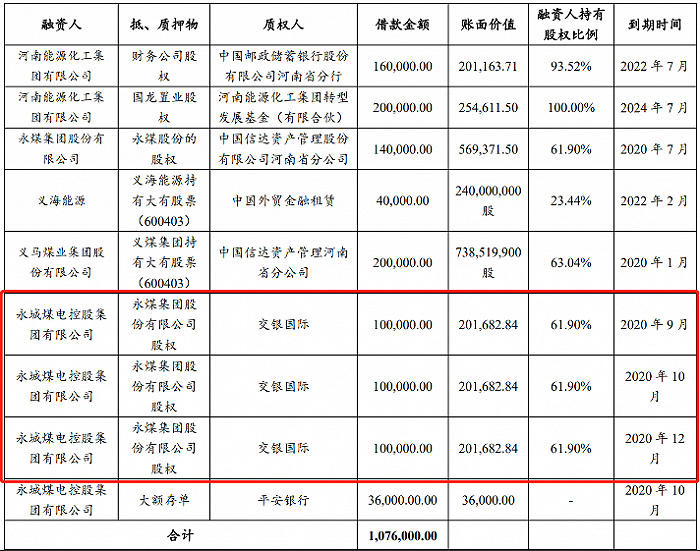 此外,永煤集团与交银国际还有3笔股权质押。永煤集团将其持有的控股子公司永煤集团股份有限公司61.90%股权作为质押物,向交银国际累计借款30亿元,今年9月、10月、12月到期。