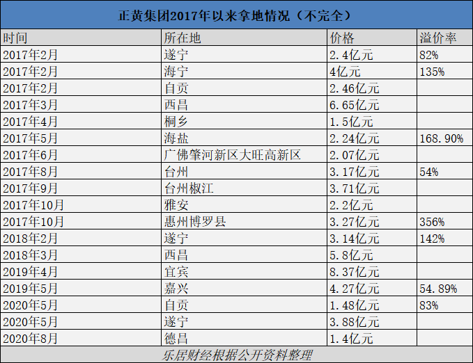 2017年更为激进。当年2月,正黄先是以2.4亿元、82%的溢价率斩获遂宁“地王”,两日后又以4亿元成交总价、135%溢价率,击败中南、碧桂园等10余家房企,拿下浙江海宁经开区地块;5月,正黄以2.24亿元、168.9%溢价率摘嘉兴海盐一宗宅地,10月以3.27亿元拿下广东惠州博罗县地块,溢价率高达356%。