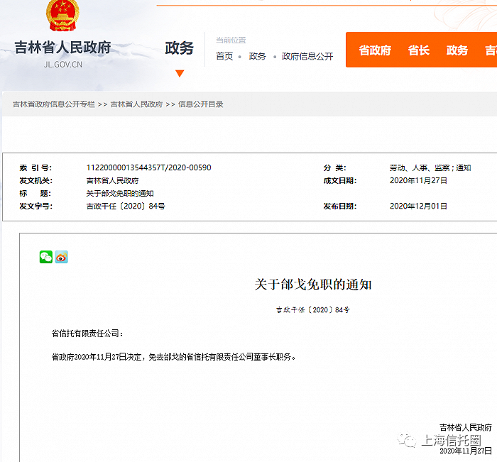 12月1日,吉林省人民政府网站公布《关于邰戈免职的通知》,通知显示,吉林省政府2020年11月27日决定,免去邰戈的省信托有限责任公司董事长职务。