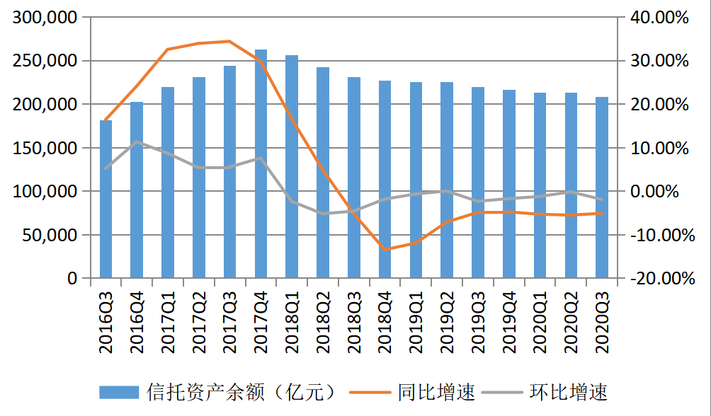 在监管的引导下,融资和通道类业务规模实现压降。截至2020年三季度末,信托业受托管理的信托资产余额为20.86万亿元,较年初减少7432.79亿元,同比下降5.16%,降幅较二季度末收窄0.4个百分点;信托资产余额较二季度末减少4182.31亿元,环比下降1.97%,降幅比二季度扩大了1.75个百分点。