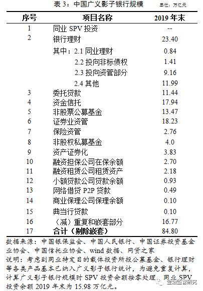 截至2019年底,中国广义影子银行规模为84.80万亿元,占2019年国内生产总值的86%,相当于同期银行业总资产的29%。