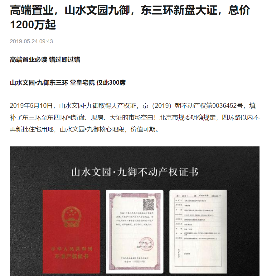 出事的正是2019年5月开始预售的北京山水文园·九御项目。
