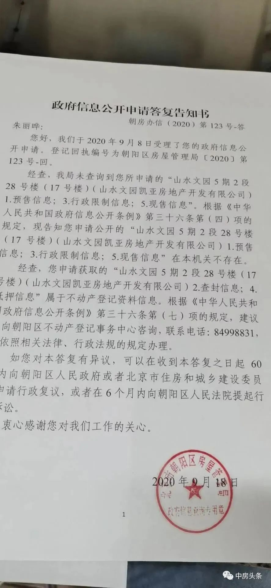 北京市朝阳区人民政府南磨房地区办事处对此事,则表示不予受理。