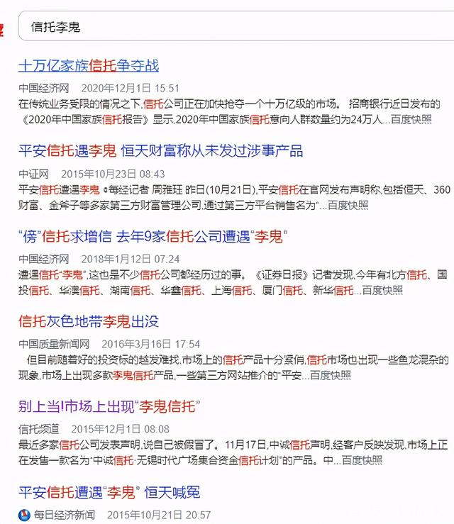 在搜索引擎上以“信托李鬼”两个字进行搜索,会发现很多都是陈旧的新闻。即使在搜索引擎的第一页,也能看到15年的旧新闻,说明这不是新鲜事情。