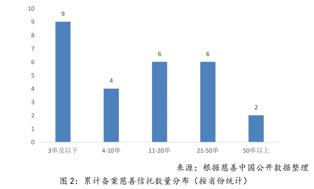尽管慈善信托备案地已经覆盖全国27个省市,但是慈善信托区域不平衡现象依旧突出。慈善中国数据统计显示,这27个省市中,有9个省累计备案数量不足3单,主要集中在内蒙古、新疆等边远省份以及辖内信托公司数量较少的省份。未来,还应在相关地区继续加强慈善信托宣传、交流力度,提升各界对慈善信托认知度。