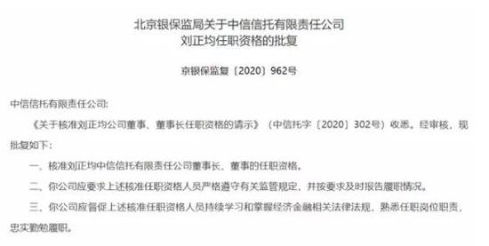 12月23日,北京银保监局发布批复,核准刘正均出任中信信托董事长、董事的任职资格。