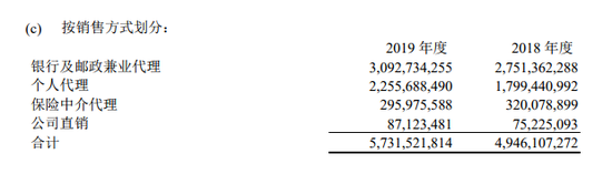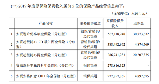 究其缘由,中德安联保费来源于四个渠道,其中银行渠道占比最重,这就导致公司成本负担大。据2019年年报显示,2019年中德安联通过银邮渠道获得保费收入为30.93亿元,在总保费中占比达到了53.96%。与此同时公司2019年保费收入前五大产品均毫不例外为分红型。