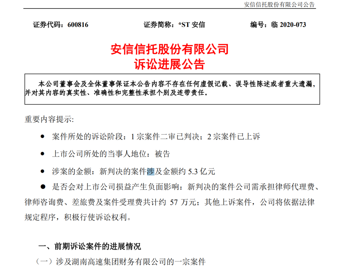 2020年1月,湖南高速将安信信托告上法庭。8月,湖南省长沙市中级人民法院作出一审判决,安信信托向原告湖南高速支付信托受益权转让价款本金4亿元及信托资金及收益(收益按年利率 7.5%支付)、违约金(按年利率 10%,限定总额不超过1.25亿)、代理律师费98万元、律师咨询费60万元、差旅费9万元。