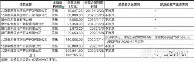 截至2020年7月7日,泰禾集团已到期未付的债务270.65亿元,除15亿元中期票据“17泰禾MTN001”和银行借款30.89亿元,其余均为非银行金融机构的融资逾期,其中信托借款余额约为66.28亿元。