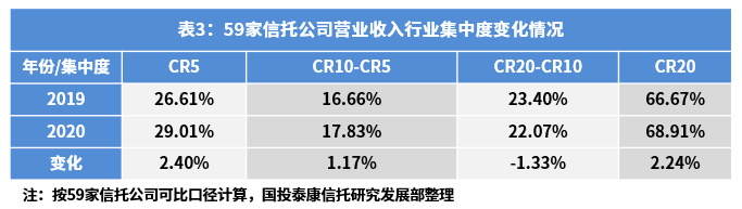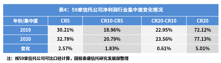 从行业资产变化情况来看,竞争门槛逐步抬高。按59家信托公司可比口径计算,2020年信托公司净资产的中位数为82.21亿元,较2019年同期增加10.03亿元,行业头部净资产规模不断攀升。此外,位于2019年净资产排名前二十名的信托公司,在2020年有18家实现净资产提升,净资产共计增加412.19亿元,占2020年净资产增加总额的74.09%。位居行业上游公司不断加码,巩固自身优势,促使行业竞争加剧。