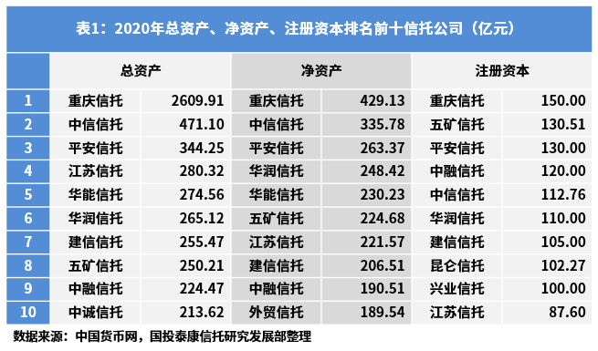 截至2020年底,在已披露的59家信托公司中,有46家信托公司总资产增加,总资产中位数为100.9亿元,总资产达百亿以上的信托公司有31家,较去年净增2家;有49家信托公司净资产增加,净资产中位数为82.21亿元,净资产达百亿以上的信托公司有20家,较去年净增1家;有11家信托公司注册资本增加,注册资本中位数为40亿元,注册资本达百亿以上的信托公司有9家,较去年净增2家。