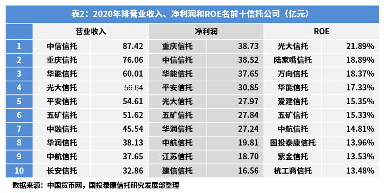注2:本文采用合并报表财务数据的信托公司共有5家,分别为:重庆信托、中信信托、华能信托、英大信托、粤财信托。