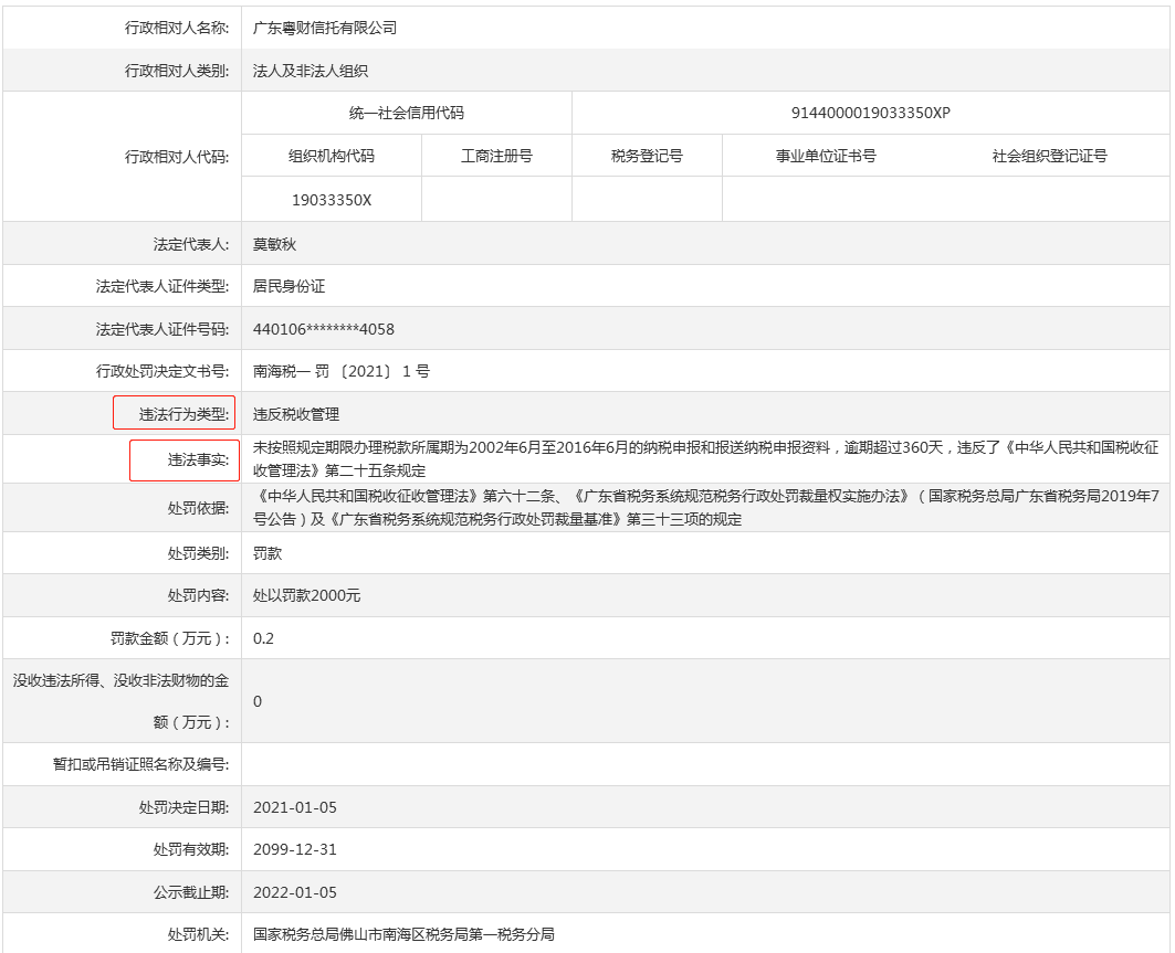 中国经济网北京1月21日讯 (记者 马先震) 近日,国家税务总局佛山市南海区税务局第一税务分局对广东粤财信托有限公司(以下简称:“粤财信托”)罚款2000元,其违法事实为未按照规定期限办理税款所属期为2002年6月至2016年6月的纳税申报和报送纳税申报资料,逾期超过360天。行政处罚决定文书号:南海税一罚[2021]1号。记者查询发现,粤财信托为广东粤财投资控股有限公司(以下简称:“粤财控股”)旗下子公司。
