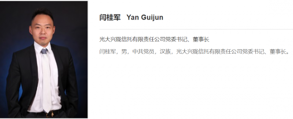 据悉,闫桂军于2015年4月出任光大信托总裁,2018年6月起代行光大信托董事长职权,2019年3月任光大信托董事长。