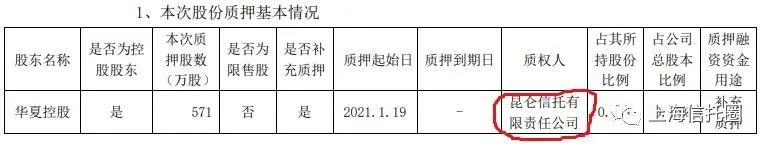 导读:华夏控股本次股份质押,系为其前期质押融资业务进行的补充质押。本次股份质押571万股,质权人:昆仑信托有限责任公司,质押融资资金用于补充质押。