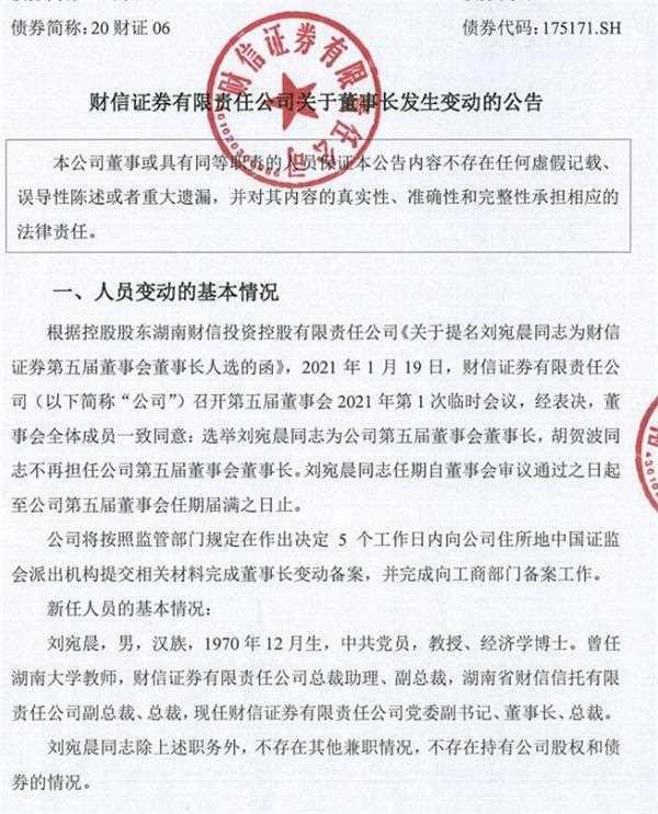 1月21日,财信证券公告,根据控股股东湖南财信投资控股有限责任公司《关于提名刘宛晨同志为财信证券第五届董事会董事长人选的函》,财信证券董事会一致同意,选举刘宛晨为公司第五届董事会董事长,胡贺波不再担任第五届董事会董事长。tE5财经新闻网