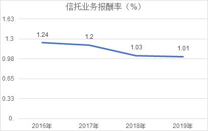 根据重庆信托历年财报数据,2016年-2019年,该公司信托报酬率分别是1.24%、1.2%、1.03%、1.01%。