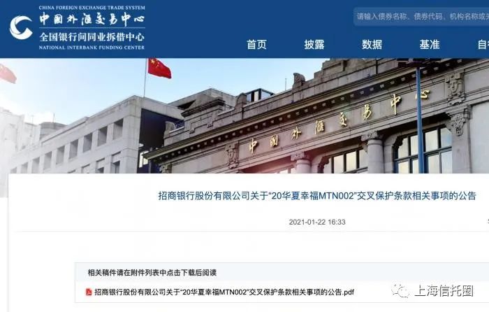 1月22日,招商银行作为华夏幸福2020年度第二期中期票据的主承销商,在中国货币网披露了关于“20华夏幸福MTN002”交叉保护条款相关事项的公告。