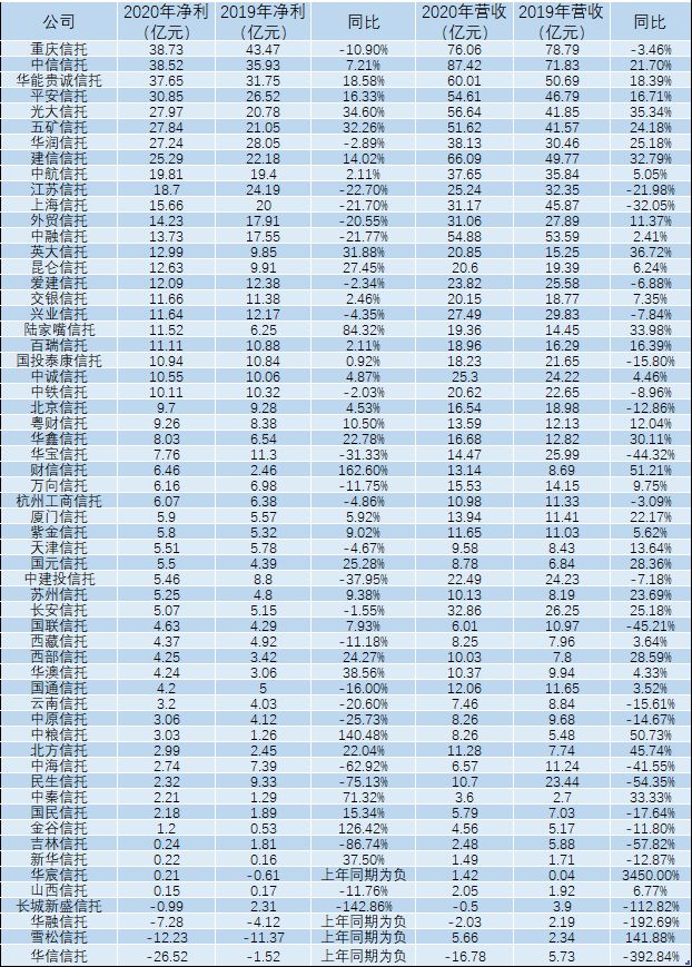 59家信托公司合计实现净利润541.81亿元,同比下降4.57%。其中,有32家公司2020年净利润实现了正增长,净利润中位数为6.07亿元。