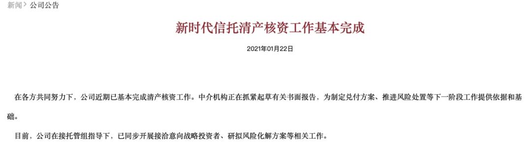 1月22日,新时代信托披露称,在各方共同努力下,公司近期已基本完成清产核资工作。中介机构正在抓紧起草有关书面报告,为制定兑付方案、推进风险处置等下一阶段工作提供依据和基础。目前,公司在接托管组指导下,已同步开展接洽意向战略投资者、研拟风险化解方案等相关工作。
