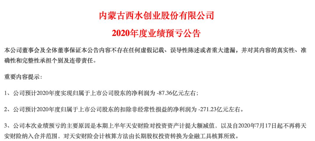 受累子公司天安财险投资踩雷,西水股份2020年预估亏损超80亿元。