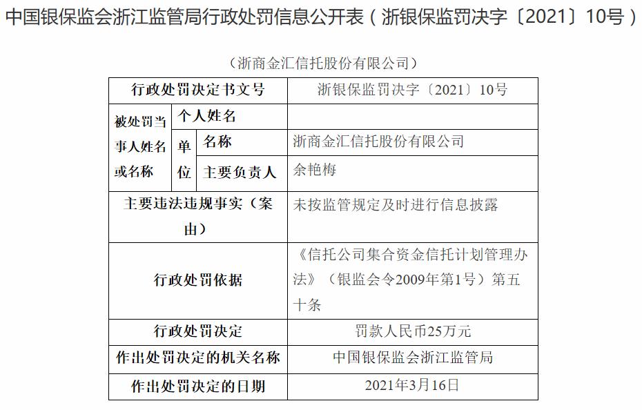 本月25日,中国银保监会浙江监管局公告对浙商金汇信托(简称“浙金信托”)的处罚信息。