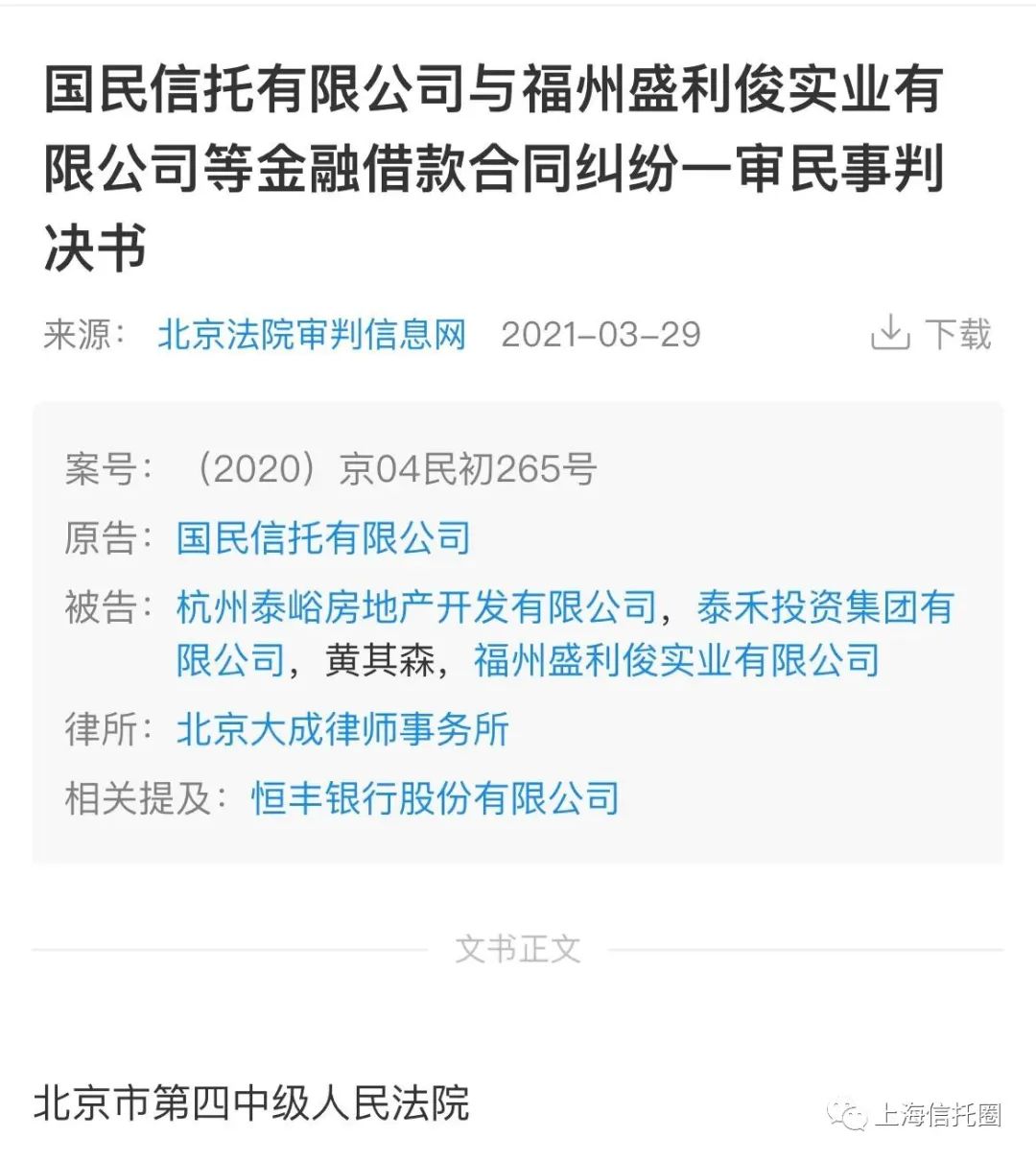 北京市第四中级人民法院日前公布判决书。就国民信托有限公司与泰禾投资集团、福州盛利俊实业有限公司等金融借款合同纠纷作出一审民事判决。泰禾未出庭北京四中院缺席审判。