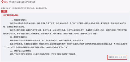 由于业主的反映,金水区丰产路街道办事处通过领导留言板回复了项目进展情况:“该项目2019年6月因总包单位退场,导致项目处于停工状态。总包单位退场后,名门地产公司积极与原总包单位就退场一事进行磋商。目前新总包单位已进场,临建房主体已搭设完成。”