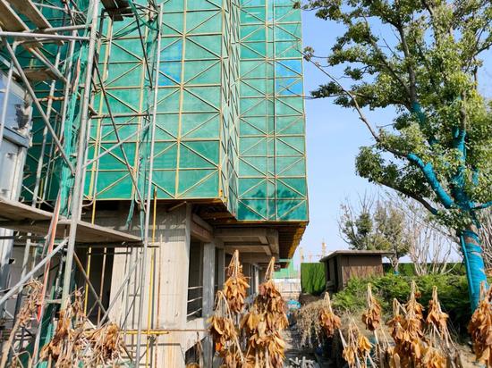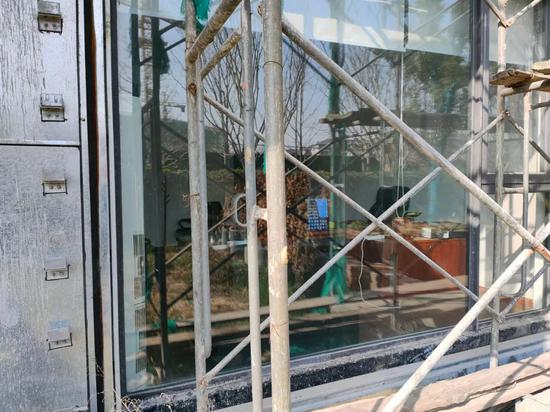 一道临时金属墙隔开了办公区和施工现场,脚手架散落一地,一片狼藉。