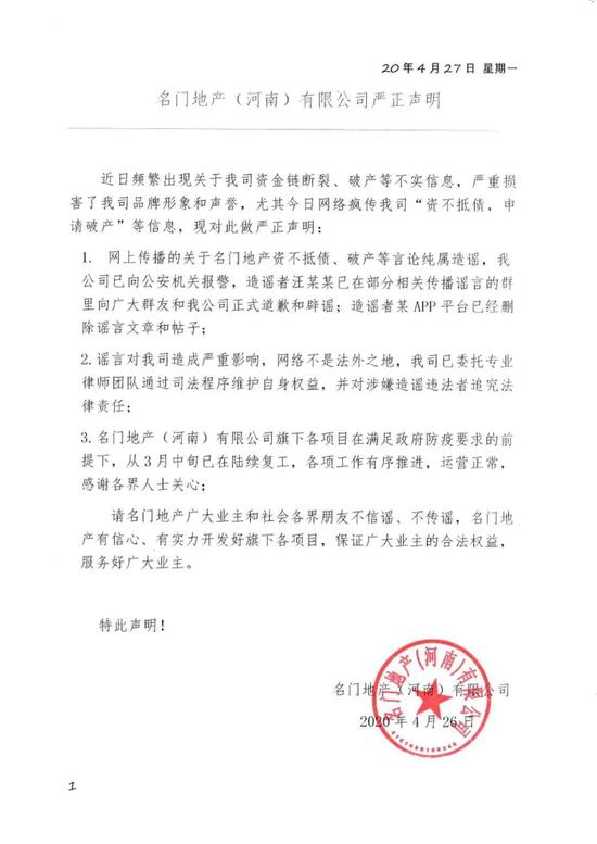 去年4月26日一条源自某投融资讯平台的“名门资不抵债已申请破产”消息,许是名门本轮风波的导火索。4月26日、4月27日,名门地产官微连续两天发布严正声明辟谣,并表示已经报警,火速平息“恐慌”。