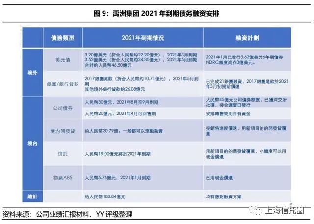 截至2020年末,禹洲集团有息债务总额639亿元,其中短期占比约30%。一年内到期债务方面,得益于公司2021年初新发5.62亿元美元债用于偿还2021年上半年到期的两笔美元债,以及完成新的银团融资贷款(不超过3.685亿美元)提前一个多月偿还了2021年5月到期的2017银团尾款,公司短期的流动性压力应较小。对于剩下的到期债务,公司也都做了融资计划安排。