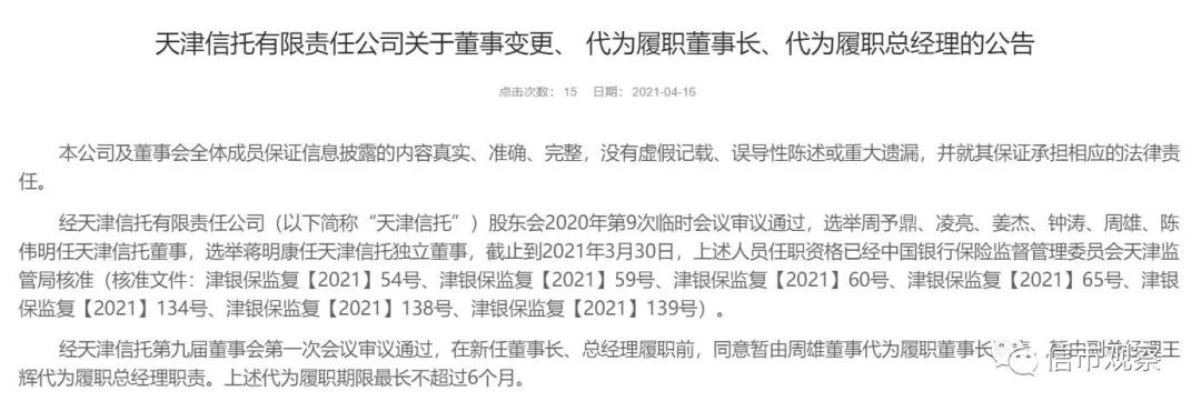 天津信托在公告中表示,其股东会2020年第9次临时会议审议通过,选举周予鼎、凌亮、姜杰、钟涛、周雄、陈伟明任天津信托董事,选举蒋明康任天津信托独立董事,截止到2021年3月30日,上述人员任职资格已经中国银行保险监督管理委员会天津监管局核准(核准文件:津银保监复【2021】54号、津银保监复【2021】59号、津银保监复【2021】60号、津银保监复【2021】65号、津银保监复【2021】134号、津银保监复【2021】138号、津银保监复【2021】139号)。