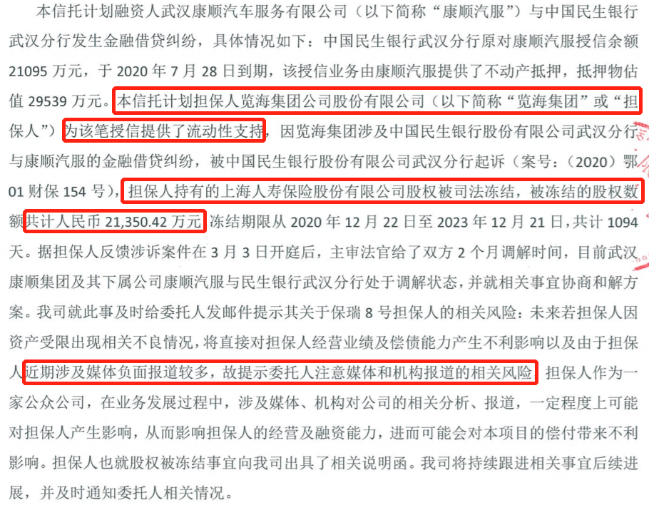 西藏信托在风险提示中表示,民生银行武汉分行对康顺汽服有一笔授信业务去年7月到期,由康顺汽服提供不动产抵押,抵押物估值3亿元,览海集团为该笔授信提供了流动性支持。但因览海集团涉及前两者的金融借贷纠纷被起诉,其持有的上海人寿保险股份有限公司共计2.13亿元的股权被冻结。冻结期限从2020年12月22日至2023年12月21日,共计1094天。