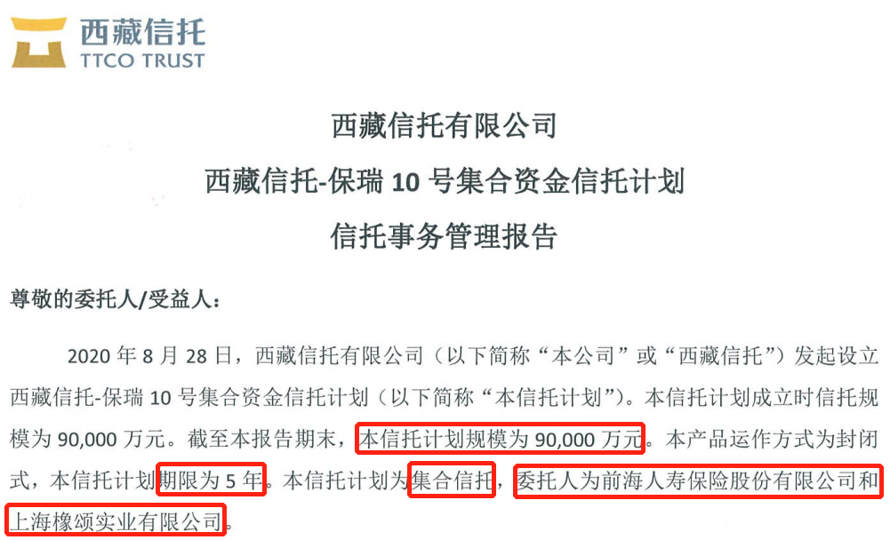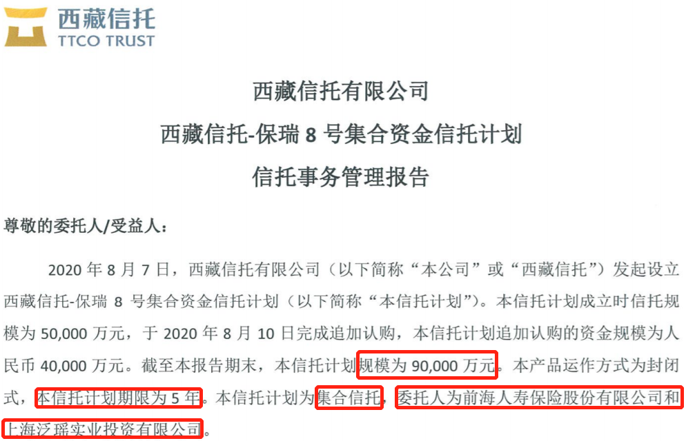 这两款信托计划分别为“保瑞8号”和“保瑞10号”。其中,“保瑞8号”于2020年8月7日发起设立,期限为5年,信托规模为5亿元,于2020年8月10日完成追加认购,截至报告期末,该信托计划合计规模为9亿元。