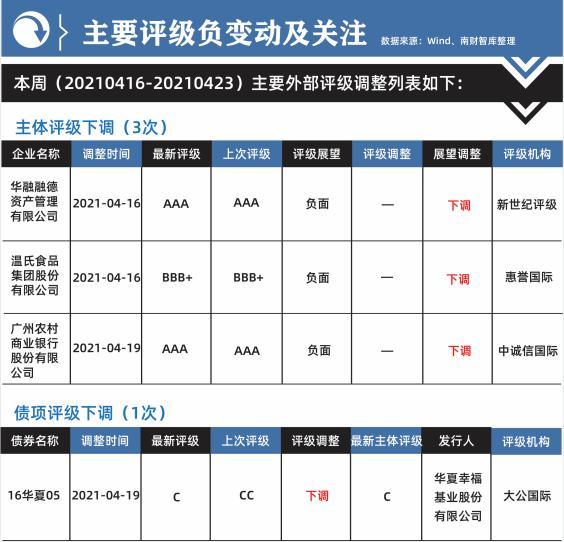 本周的外部评级下调共涉及3个主体,1个债项,共计4项评级负面事件:其中华融融德资管、温氏股份和广州农商行的评级展望均由“稳定”被下调至“负面”。“16华夏05”债项评级由CC被下调至C。
