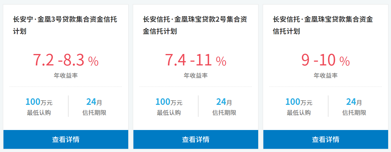 长安信托官网的产品介绍栏显示,长安信托与金凰珠宝此后一共合作开展了三期黄金质押信托计划,前两期信托计划发行规模分别为2亿元和3亿元,官网显示已顺利完成兑付。而于2017年10月发行的融资规模高达到10亿元的“长安宁•金凰3号”,却在2019年10月到期后出现延期兑付情形。