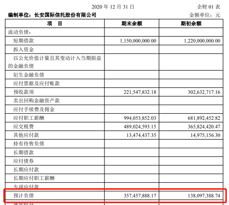 截至2020年底,长安信托新增预计负债3.57亿元,较去年同期增长1.59倍,而这一数据在2018年还是零。此外,截至期末,长安信托计提坏账准备3.28亿元,较期初增长24.24%,而2019年期末计提的坏账准备更是较2018年上涨接近30倍。同时,资产减值损失方面,2020年数据显示,报告期内共发生9.32亿,虽然较2019年的12.47亿有所下降,但也依旧超过2018年6.79亿元的水平。