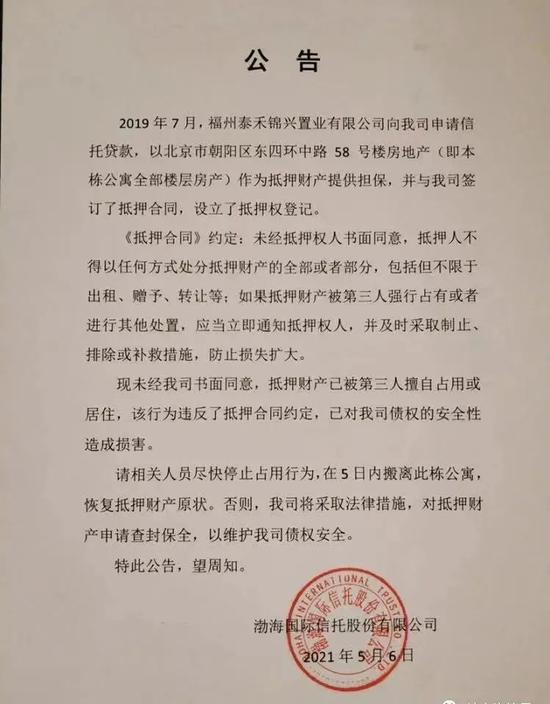 5月9日,泰禾集团收到了一封来自渤海国际信托有限公司的公告:拟查封泰禾北京公馆。