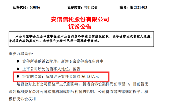 目前,对于这六起新增的诉讼,安信信托表示,案件尚在审理中,暂无法判断相关诉讼对公司本期利润或期后利润的影响。公司将依据法律规定程序,积极行使诉讼权利。