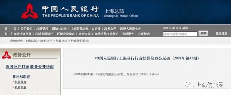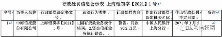 3月9日,中国人民银行上海分行对中海信托下发行政处罚决定书(上海银罚字【2021】1号),对中海信托警告罚款70.2万元。