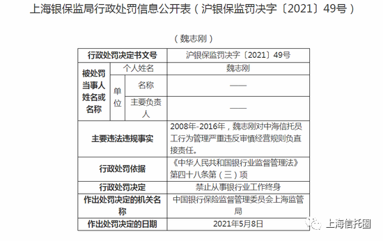 此外,魏志刚对中海信托员工行为管理严重违反审慎经营规则负直接责任,被终身禁业。