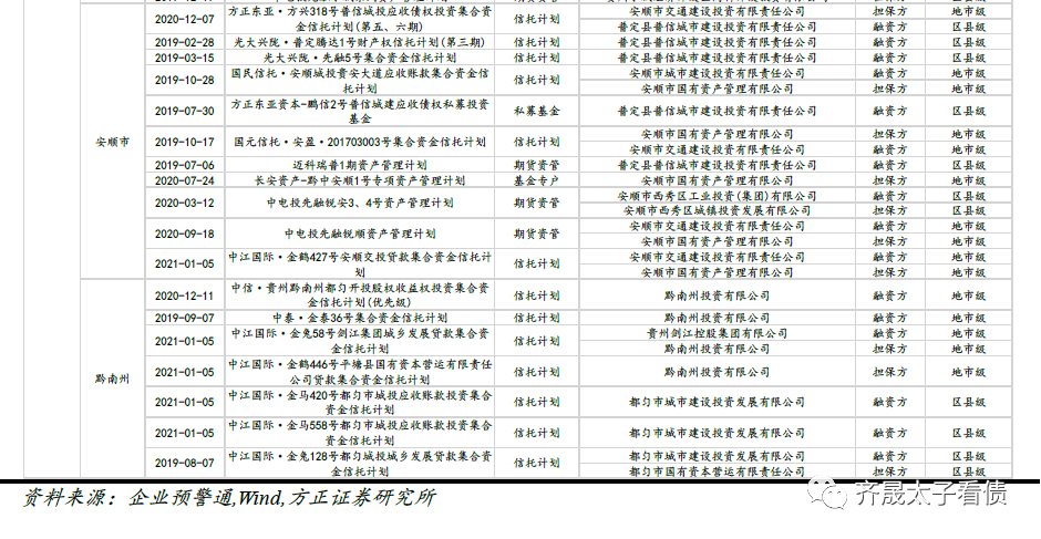 自2018年开始,城投非标违约频发,我们也持续跟踪了发债城投作为融资方/担保方涉及非标违约的情况。截至2021年5月15日,共统计到近百个逾期未解决的非标产品,涉及52家发债平台作为融资方/担保方,其中,贵州区域非标违约最为严重,区县级平台数量占比最高。具体统计详情请见下文图表。