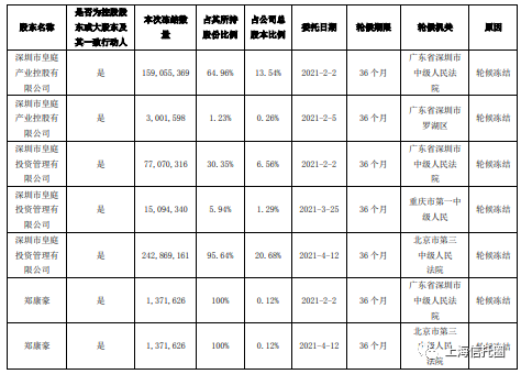 皇庭国际股份被司法冻结