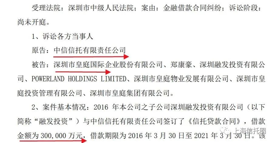 上海信托圈公号关注到,2016年皇庭国际公司之子公司深圳融发投资有限公司与中信信托有限责任公司签订了《信托贷款合同》,借款金额为30亿元。